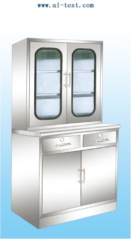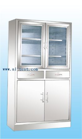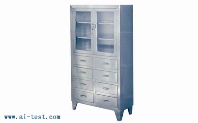 不銹鋼雙門器械柜(日式)備注:上玻璃雙開門,內有四層活動隔板,上兩側面裝玻璃,中間二抽屜,下不銹鋼雙開門規格:900*360*1700 |