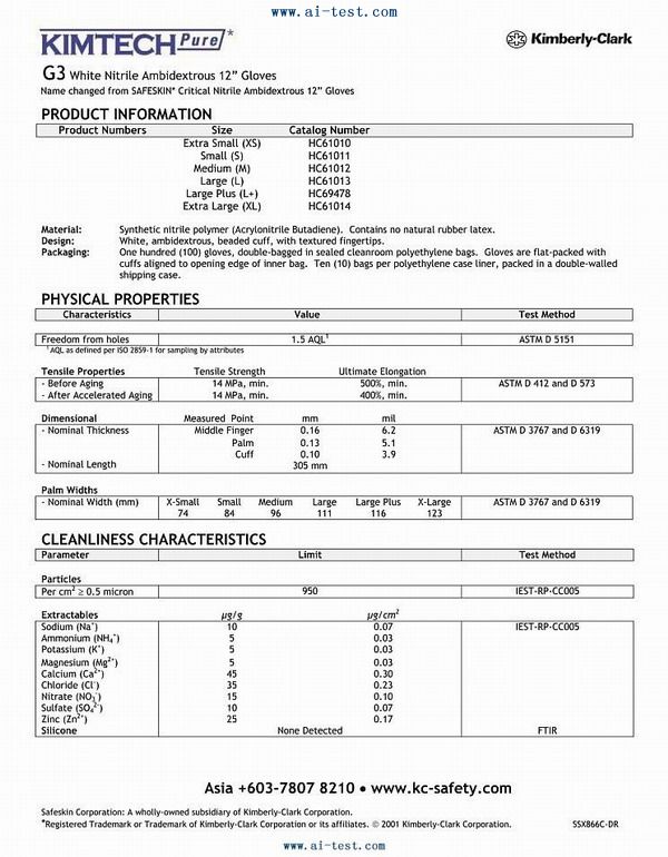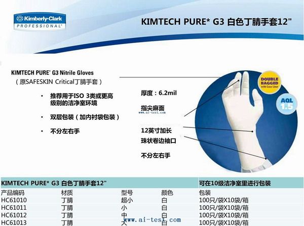 KIMTECH PURE* G3 白色丁腈手套12"HC61010-HC61013.推薦用于ISO 3類或更高級別的潔凈室環境.雙層包裝(加內襯