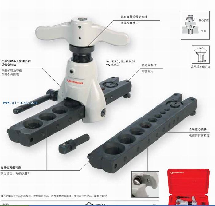 AM514742 | 偏心擴喇叭口器:專業擴喇叭口工具;在銅管上精確到45°擴管;組套包括:在塑料盒內的偏心擴喇叭工具,公英制尺寸:6-8-10-12-14-15-16-18mm;品牌:德國ROTHENBERGER | 1件 | 洽詢 | 洽詢 | 備注 |