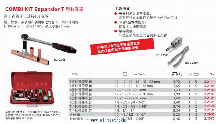 T型拉孔器:用于在管子上制造支管或T形接頭;用于軟銅、半硬銅和硬銅制造的管子,鋁合金制鋼;尺寸:10-12-14-16-18-22mm;品牌:德國ROTHENBERGER
