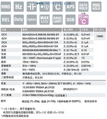 AL905692 | 數字萬用表:高精度及多功能萬用表;4位9999數據點及3-5/6位6000數據點;雙數據顯示電壓/電流及其頻率,以及AC元件和DC元件的電壓/電流;AC實效值;電場檢測功能,運用接觸法/非接觸法探測導體的電激活/停用狀態;峰值捕捉,保持功能;最大,最小,平均值記錄模式;K型溫度測量-50-1000度;頻率測量(僅AC正弦波);邏輯頻率測量,占空比測量;電導測量;帶背光雙數據顯示;數據保持,量程保持;自動量程的相對值測量;自動省電模式(30分鐘,可取消);光電USB接口(選配);品牌:日本SANWA | 1 | 2650 | 洽詢 | 備注 |