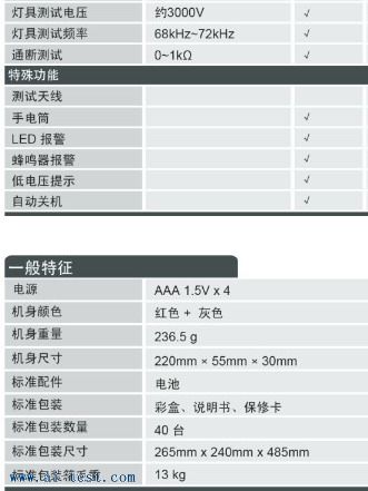 功能特點 :快速測量低壓鈉燈,高壓鈉燈(≤110W),氖燈,節能燈,無極燈,汞燈等燈具;通斷功能來判斷多種燈具電
