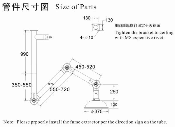 A2601084 | 三節萬向抽氣罩(懸掛式):關節:采用高密度PP聚丙烯材質,可360°旋轉調節方向,易拆卸、重組及清洗 ;關節密封圈:采用不易老化的高密度橡膠 ;關節連接桿:304不銹鋼連接桿 ;關節松緊旋鈕:高密度PP材質,內嵌不銹鋼軸承,與關節連接桿鎖合 ;氣流調節閥:方便的手動調節外部閥門旋鈕,控制進入之氣流量 ;集氣罩:PP白色/紅色/透明, PC全透明大罩;品牌:中國 | 1 | 2000 | 洽詢 | 備注 |