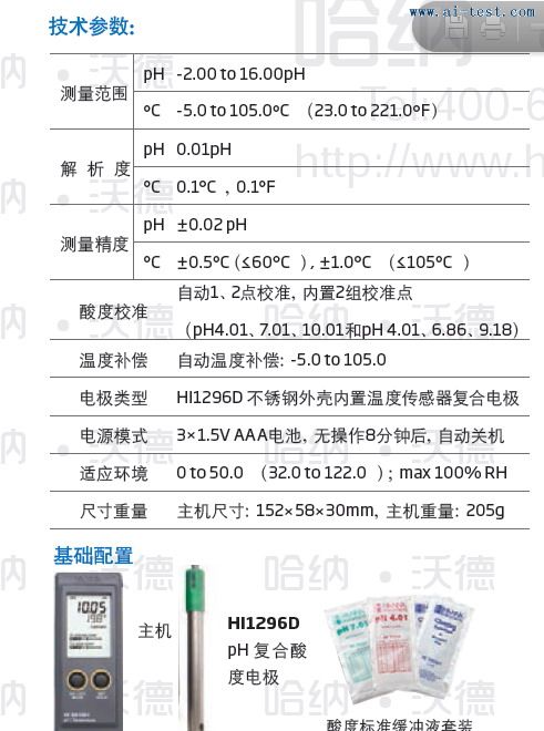 30100-0191 | 微電腦酸度pH-°C測定儀:量程:pH值: -2.00 to 16.00 pH;溫度: -5.0 to 105.0°C / 23.0 to 221.0°F;解析度:pH值:0.01 pH;溫度: 0.1 °C ;0.1°F;精度:pH值:±0.02 pH;溫度:± 0.5°C (-5 to 60°C),± 1°C (60 to 105.0°C);± 1.0°F (23 to 140°F),± 1°F (140 to 221.0°F);pH校準: 自動1點或2點校準,內存2組校準點 (pH 4.01 / 7.01 / 10.01 or pH 4.01 / 6.86 / 9.18);溫度補償: 自動溫度補償,-5.0 to 105.0°C / 23.0 to 221.0°F;供電方式: 3 x 1.5V AAA電池,關機設定;無任何操作20分鐘后,儀器自動關機 電極類型:HI1296D內置溫度傳感器不銹鋼金屬PH電極;使用環境: 0 to 50°C (32 to 122°F);RH max 100%;尺寸重量:152 x 58 x 30mm ;205 g;配置:主機,30100-0192內置溫度傳感器鈦外殼復合酸度電極(DIN接口、1米線長),pH4.01和7.01袋裝校準液(各20ml),中英文手冊 ,專業攜帶箱;品牌:意大利HANNA | 1 | 3700 | 洽詢 | 備注 | |