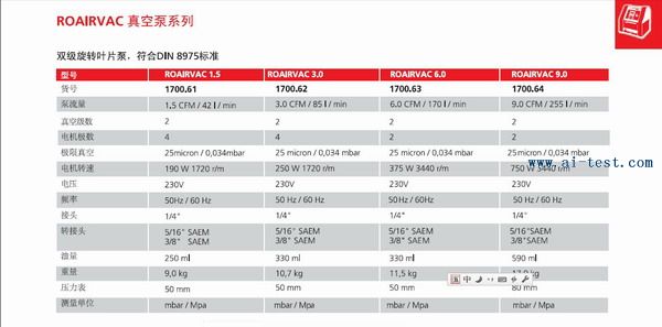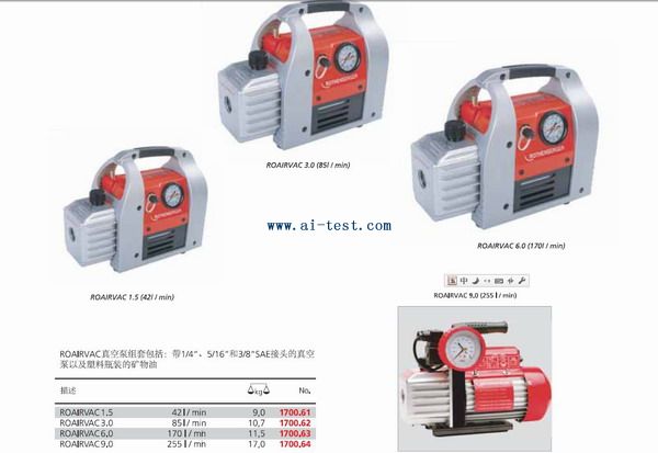 AM514749 | 真空泵:玻璃視窗易于觀察油位;泵流量:1.5CFM/42L/min;電機極數:4;電機轉速:190W1720r/m;油量:250ml;重量:9kg;品牌:德國ROTHENBERGER | 1臺 | 洽詢 | 洽詢 | 備注 | |