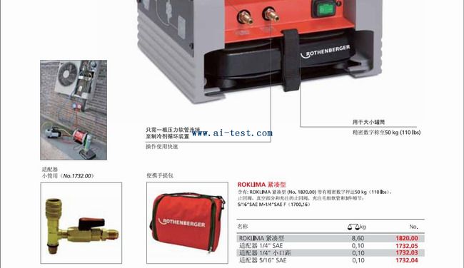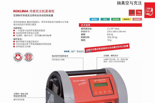 AM514753 | ROKLIMA冷媒充注機緊湊型:最終真空度:2*0.01mbar;外形尺寸:270*240*230mm;重量:8.6kg;稱重范圍:可達50kg;精度:10g;品牌:德國ROTHENBERGER | 1臺 | 洽詢 | 洽詢 | 備注 | |