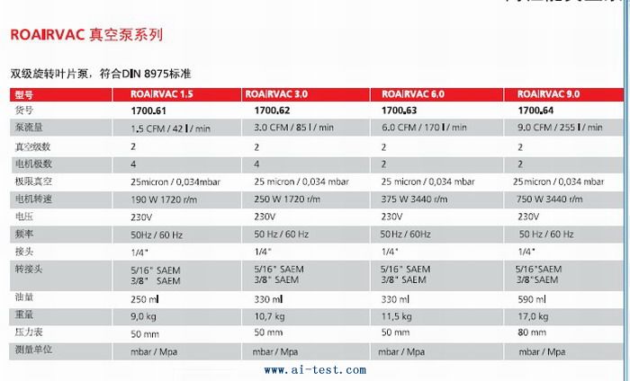 AM514764 | 高性能真空泵:雙級旋轉葉片泵;符合DIN8975標準;泵流量:1.5CFM/42L/min;電機極數:4;電機轉速:190W1720r/m;油量:250ml;重量:9kg;品牌:德國ROTHENBERGER | 1臺 | 洽詢 | 洽詢 | 備注 |