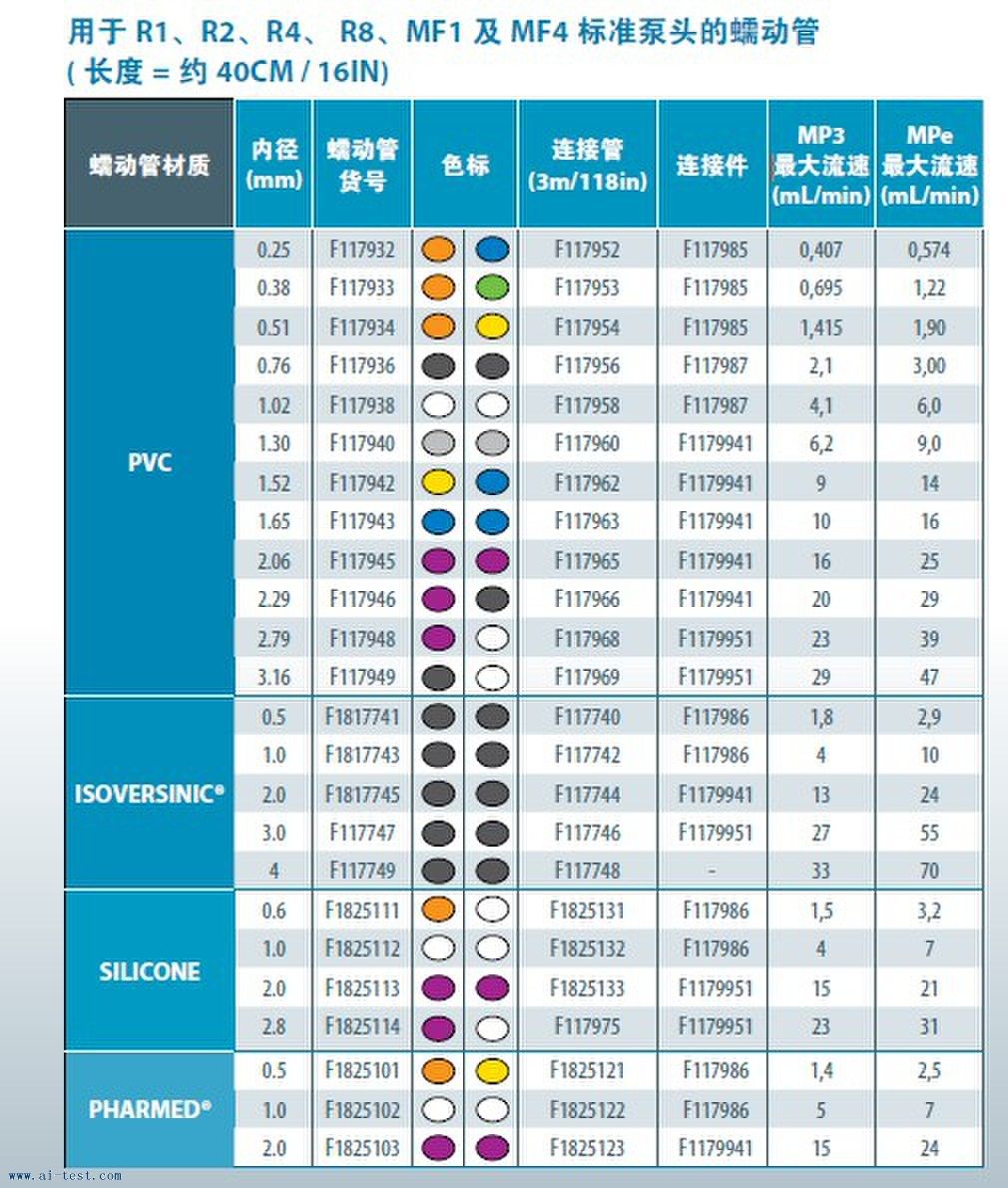 選擇合適的蠕動管根據:;您使用液體的化學兼容性選擇合適的蠕動管和材質• 四種可選用的蠕動管:
