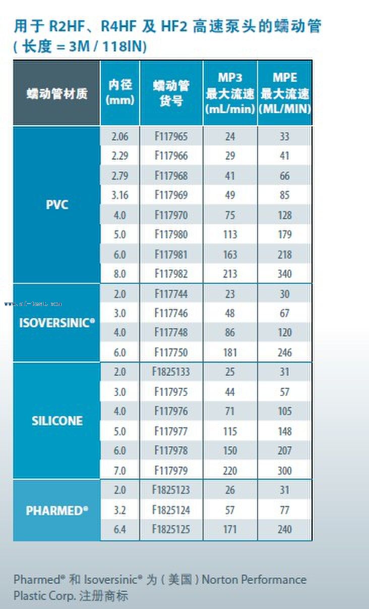 1.PVC,一般通用,2.硅樹脂,化學兼容性強,多用于生物制品,3..Pharmed® 符合USP & fDA 4 級標準,多用于藥物和食物方面4.Isoversinic® 可用于化學腐蝕液體。• 根據最高的流速要求。