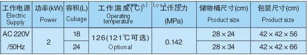 A101132 手提式不銹鋼壓力蒸汽滅菌器(普通型、防干燒型):容積:24L;儲物桶尺寸cm:28×34;包裝尺寸cm:42×42×66;其他參數與A101131一樣;品牌:中國 1 2625 洽詢 備注