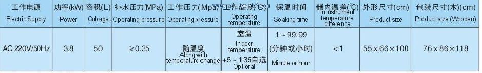 反壓高溫蒸煮鍋:工作電源AC 220V/50Hz;功率:3.8kw;容積:50L;補水水壓≥0.35MPa;工作壓力MPa:隨溫度;工作溫度; 室溫+5℃-135℃自選;保溫時間:1-99.99分鐘或小時;器內溫差:<1℃;外形尺寸cm:55×66×100;包裝尺寸(木)cm:76×86×118;品牌:中國 |