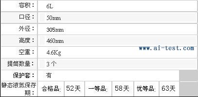 A130273 | 液氮罐:容積:6L;口徑:50mm;外徑:305mm;高度:460mm;空重:4.6kg;提筒數(shù)量:3個;保護套:有;靜態(tài)液氮保存期:合格品:52天,一等品:58天;優(yōu)等品:63天;品牌:中國 | 1 | 1800 | 洽詢 | 備注 | |