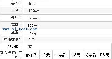 A130290 | 液氮罐:容積:16L;口徑:125mm;外徑:365mm;高度:600mm;空重:9kg;提筒數量:3個;保護套:有;靜態液氮保存期:合格品:42天,一等品:48天;優等品:53天;品牌:中國 | 1 | 3780 | 洽詢 | 備注 | |