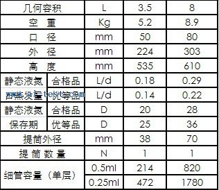航空運輸型液氮罐:幾個容積L:3.5;空重kg:5.2;口徑mm:50;外徑mm:224;高度mm:535 ;靜態液氮日蒸發量l/d:0.14;靜態液氮保存期d:25;提筒外徑mm:38;提筒數量:1;細管容量(單層)0.50 ml和0.25ml:214和472;品牌:中國 |