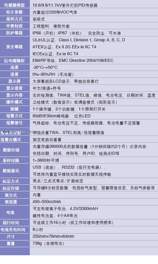 AL830185 | VOC檢測儀:;是一款當今市場上最靈敏的廣譜手持式揮發性有機化合物(VOC)氣體檢測儀,采用RAE最新的第三代光離子化檢測器(PID),提高了檢測精度和響應時間,檢測范圍達到1ppb-10000ppm顯示內容: 實時檢測值、TWA值、STEL值、峰值、電池電壓、日期時間、溫度 ;數據存儲: 內置存儲260000點的數據容量(1分鐘間隔約2個月)記錄內容包括日期、時間、序列號、用戶ID、檢測點ID等;采樣間隔: 1-3600秒可調;采樣泵流速: 450cc/min~550cc/min;品牌:美國RAE | 1 | 95000 | 洽詢 | 備注 |