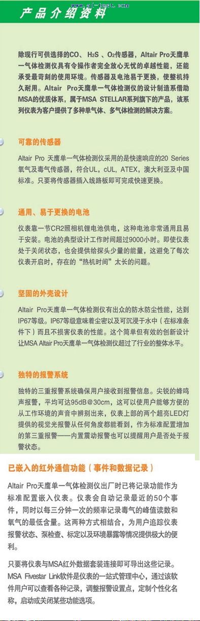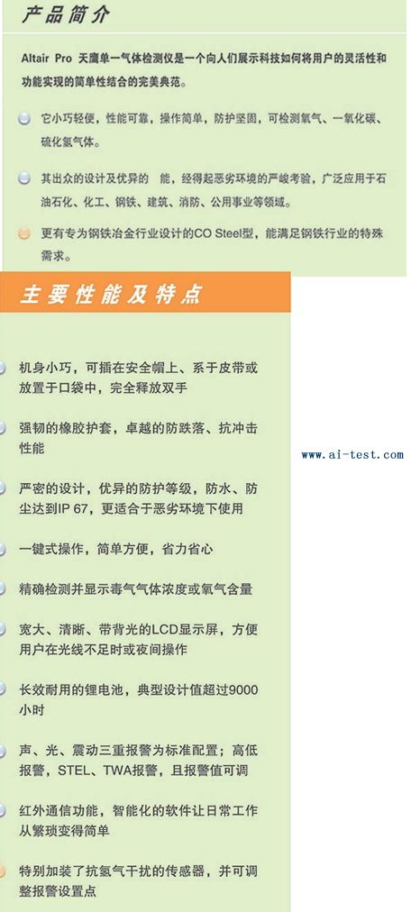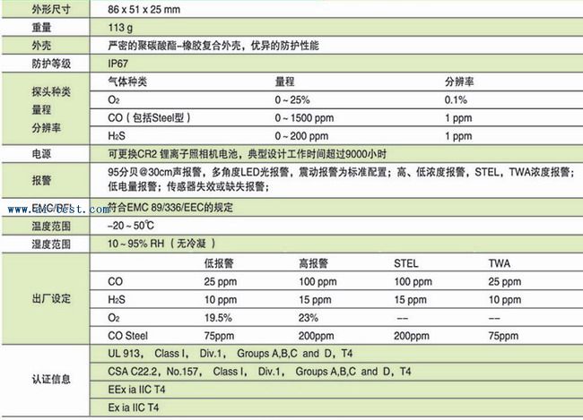 800007 | MSA 袖珍式單種氣體檢測儀(一氧化碳Steel型);外形尺寸:86*51*25mm;重量:113g;外殼:嚴密的聚碳酸酯-橡膠復合外殼,優異的防護性能;防護等級:IP67;CO量程:0~1500ppm;分辨率:1ppm;電源:可更換CR2鋰離子照相機電池,典型設計工作時間超過9000小時;報警:95分貝@30cm聲報警,多角度LED光報警,震動報警為標準配置;高、低濃度報警,STEL,TWA濃度報警;低電量報警;傳感器失效或缺失報警;EMC/RFI:符合EMC 89/336/EEC的規定;溫度范圍:-20~50℃;濕度范圍:10~95%RH(無冷凝);出廠設定CO Steel:低報警:75ppm;高報警:200ppm;STEL:200ppm;TWA:75ppm;認證信息:UL 913,Class I,Div.1,Groups A,B,C and D,T4;CSA C22.2,No.157,Class I,Div.1,Groups A,B,C and D,T4;EEx ia IIC T4;Ex ia IIC T4;品牌:美國MSA | 美國本安認證 | 1 | 洽詢 | 洽詢 | 備注 |