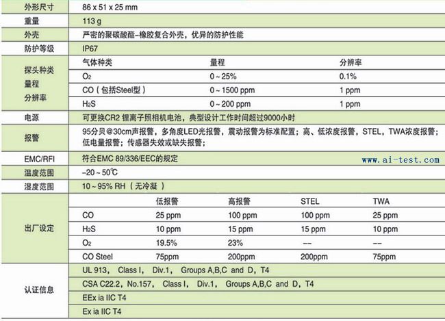 MSA 袖珍式單種氣體檢測儀(硫化氫);外形尺寸:86*51*25mm;重量:113g;外殼:嚴密的聚碳酸酯-橡膠復合外殼,優異的防護性能;防護等級:IP67;H2S量程:0~200ppm;分辨率:1ppm;電源:可更換CR2鋰離子照相機電池,典型設計工作時間超過9000小時;報警:95分貝@30cm聲報警,多角度LED光報警,震動報警為標準配置;高、低濃度報警,STEL,TWA濃度報警;低電量報警;傳感器失效或缺失報警;EMC/RFI:符合EMC 89/336/EEC的規定;溫度范圍:-20~50℃;濕度范圍:10~95%RH(無冷凝);出廠設定H2S:低報警:10ppm;高報警:15ppm;STEL:15ppm;TWA:10ppm;認證信息:UL 913,Class I,Div.1,Groups A,B,C and D,T4;CSA C22.2,No.157,Class I,Div.1,Groups A,B,C and D,T4;EEx ia IIC T4;Ex ia IIC T4;品牌:美國MSA |