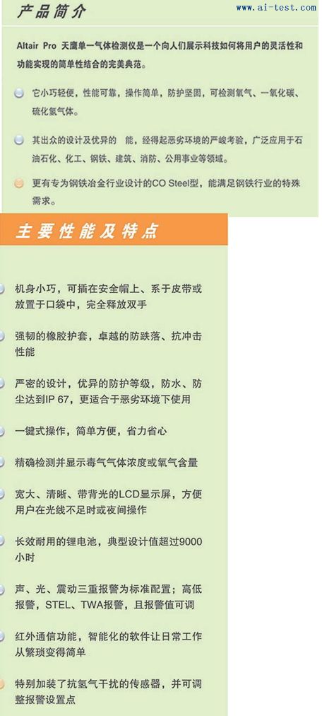刻的使用環境。傳感器及電池易于更換,使整機持久耐用。Altair pro天鷹單一氣體檢測儀的設計制造系借助MSA的優