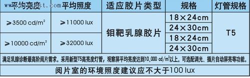 AM5100023 | 乳腺型高亮度觀片燈;亮度固定型;平均亮度:≥3500cd/m2;平均照度:11000lux;適應膠片類型:鉬靶乳腺膠片;規格:18*24cm;燈管規格:T5;使用環境條件:閱片室的環境照度建議應不大于100 lux;品牌:中國。 | 1 | 1500 | 洽詢 | 備注 | |