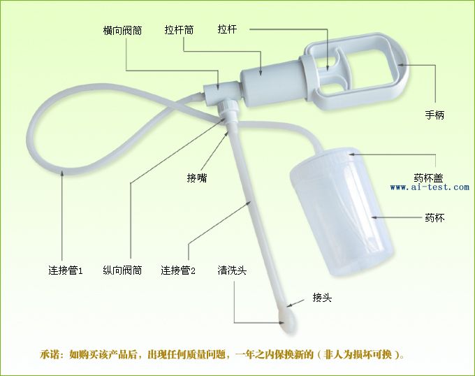 手持式鼻腔清洗器;拉桿最大拉力 大于20N(2Kg)小于60N(8Kg);藥杯最大裝藥量 180mm±10%;由清洗頭、手柄、拉桿、藥杯、筒、連接管等組成;品牌:中國。 |