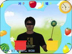 接水果:魔幻游戲中,小朋友自己手捧可愛的小果籃,接住掉下的鮮亮可愛的水果,并按不同顏色放進大的籃筐中。