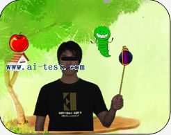 小朋友通過聽指令,看自己的形象在游戲中,直接觸摸。她觸摸的反應快慢,將會得到不同的結果。人機采成的魔幻
