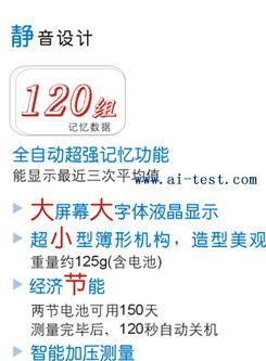 A3720174 | 電子血壓計;測量范圍: 壓力:0~280mmHg (0~37.3kPa);脈搏:40~200次/分;精度:壓力:±4mmHg(±0.5kPa)以內;脈搏:讀數的±5%以內;加壓、排氣:自動加壓、減壓;記憶數組:74組測量值;設備運行方式:間歇運行方式;電氣安全分類:BF型;壓力傳感器:電阻式壓力傳感器;電源:4節7號干電池或外接6V/600mA直流電源。品牌:YUYUE。 | 1 | 236 | 洽詢 | 備注 |