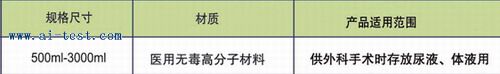 AM5500315 | 一次性使用引流袋;規(guī)格尺寸:500ml-3000ml;材質(zhì):醫(yī)用無毒高分子材料;產(chǎn)品適用范圍:供外科手術(shù)時存放尿液、體液用;品牌:中國。 | 1 | 2.3 | 洽詢 | 備注 |